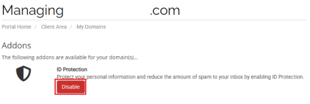 以下页面将向您显示一个禁用 whois/ID 保护的按钮。 禁用 whois/ID 保护将删除隐私保护,因此 whois 查找将公开显示您的域作为 whois 联系信息的基础。您为此服务支付的 3.00 美元费用不予退还。一旦服务被禁用,您需要支付 3.00 美元才能重新启用该服务。如果您希望继续删除保护,请单击红色的“禁用”按钮: