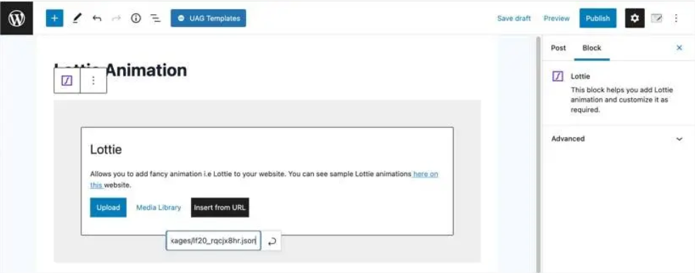 与Kadence bocks不同,UAG插件不支持上传JSON文件。因此,您只能使用“从URL插入”选项并使用来自第三方站点的Lottie文件URL。否则,您需要使用附加插件启用JSON上传支持。