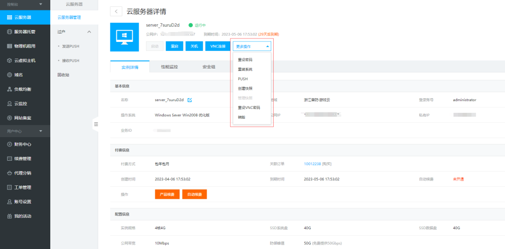 云服务器管理面板功能丰富,支持一键下单在线支付开通云服务器,支持VNC,安全组,重装重启,PUSH在线过户交易,支持性能监控,支持在线重置密码,可自行销毁主机!