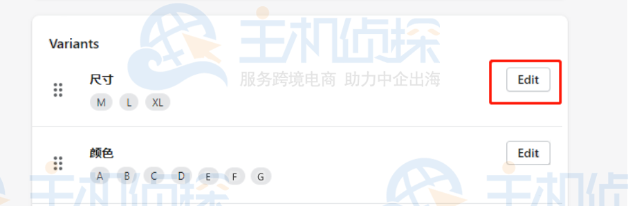 2.选择目标更改产品并打开,到达Variants部分,点击对应要修改部分的Edit