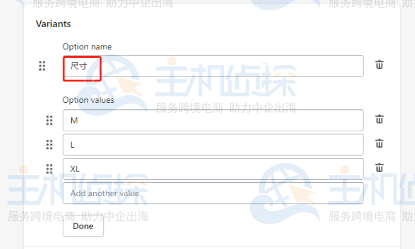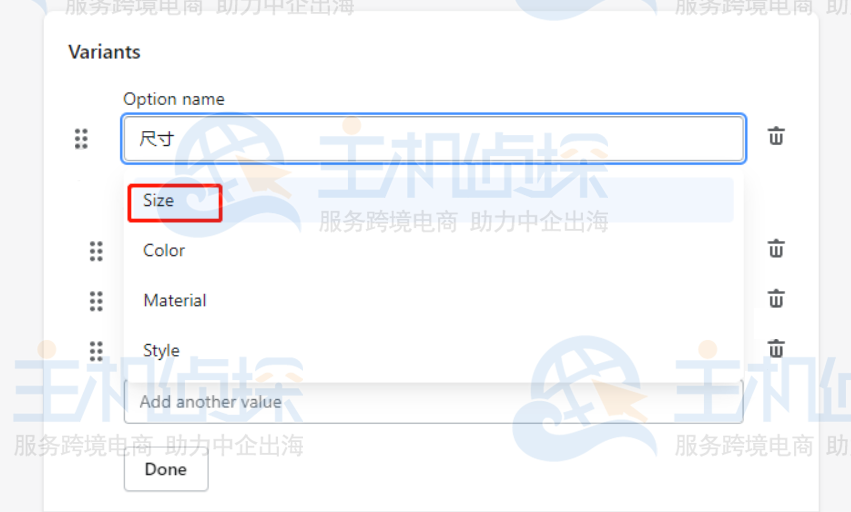 4.选择需要的变种名称。这里,如果您的Shopify独立站后台语言还是中文,那也不能直接选择英文变种。比如这里,就需要删掉“尺寸”两个字,然后手动输入“Size”。只有后台语言是英文,才能直接选择英文变种。所以为了制作产品方便,建议是把后台语言设置成英文。如果自动弹出的变种没有自己所需要的,可以手动输入。