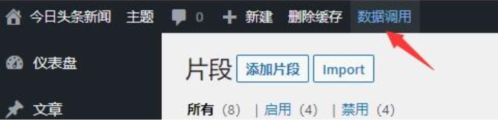 WordPress后台顶部菜单默认有“新建”菜单,这是默认的。如何新加自己的菜单呢?使用admin_bar_menu。例如在后台有设置面板,其中有一项“数据调用”,这个功能经常可以用的,而其他功能不怎么用。