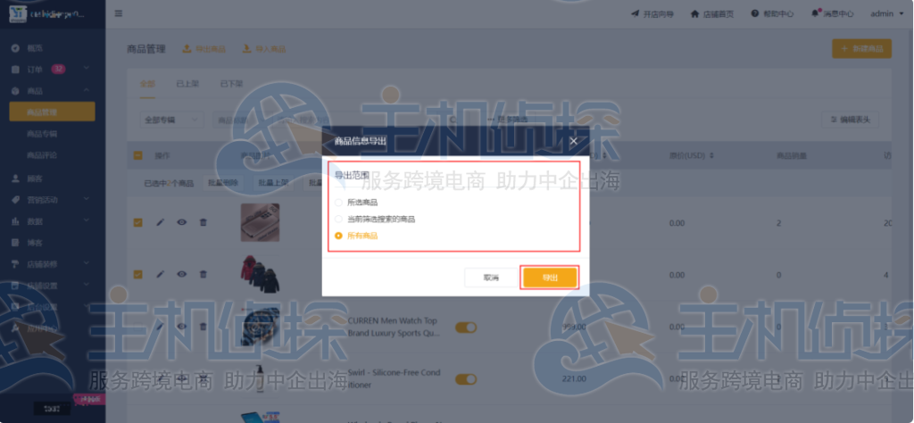 导出范围:所选商品、当前筛选搜索的商品或所有商品;