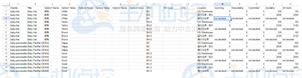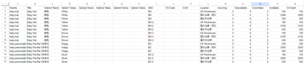 在表格的Available和On Hand列为我们新添加的仓库地址,如“渥太华仓库”补全库存数据。其他仓库的库存数据如果需要修改的话,也一并修改。修改好之后保存数据。如果是Google Sheet编辑的表格,则把表格下载到电脑。