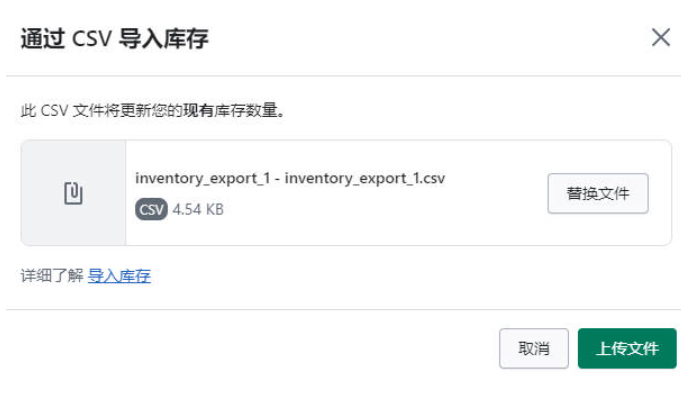 返回到Shopify独立站后台,在之前我们导出库存数据的页面,点击导出按钮旁边的“导入”按钮,选择我们刚刚设置好的库存表格,然后“上传文件”。