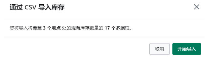 Shopify接收到表格之后,会提示表格会覆盖原有的数据“您将导入将覆盖3个地点处的现有库存数量的17个多属性”。确认没有问题之后,点击“开始导入”按钮。