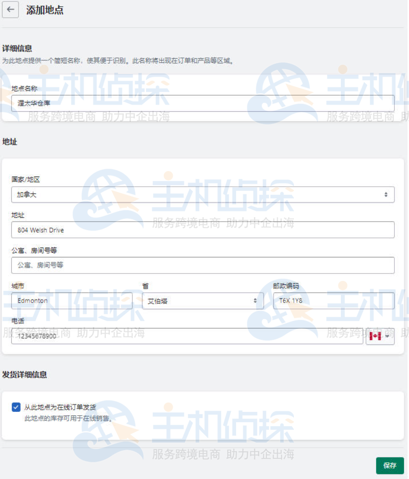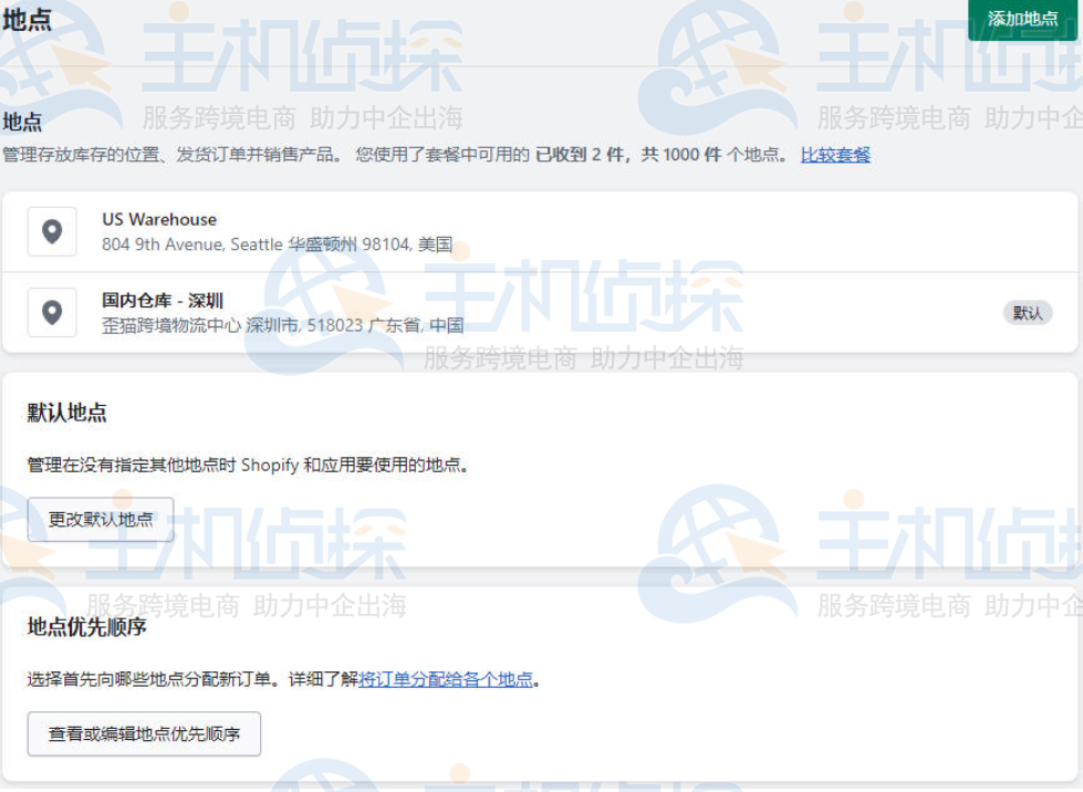 Shopify会把我们注册Shopify时所使用的地址作为默认的仓库地址。如果想要修改默认仓库地址,需要先添加仓库地址,然后再修改新添加的地点为默认仓库地址。