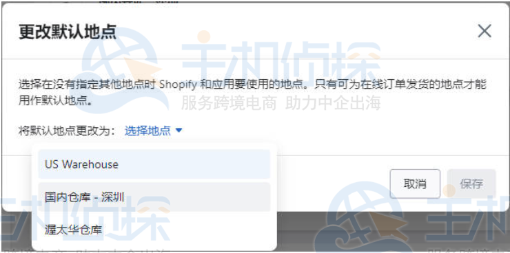 默认仓库地点是在没有指定其他地点时,Shopify系统和Shopify应用会默认使用的地点。设置某个仓库地点的前提条件是,在上一步添加地点的过程中,该地点勾选了“从此地点为在线订单发货(Fulfill online orders from this location)”。