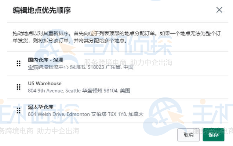 这里的地点优先顺序是有订单时,订单从哪个仓库发货的顺序。Shopify系统会优先考虑为排在比较靠前的地点分配订单。如果该地点无法为整个订单发货,例如某个产品缺货,则Shopify系统会将该订单拆分,从多个地点发货。我们可以拖到仓库地点前面的六个点图标实现地点排序。最后别忘记点击保存按钮完成设置。