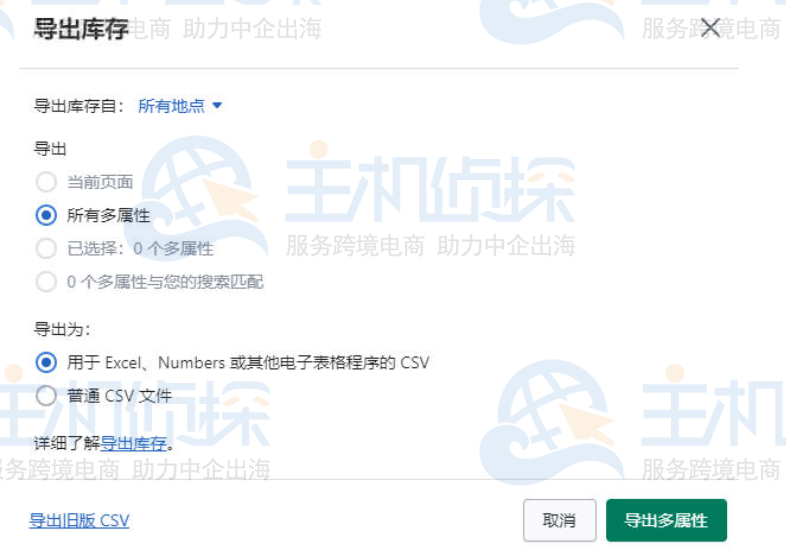 要使用库存管理表格批量录入库存数据,我们需要先下载表格。点击上图右上角的“导出”按钮,在下面的弹出窗口中,到处库存自,选择默认的“所有地点”。导出,选择“所有多属性”。导出为“用于Excel Numbers或其他电子表格程序的CSV”