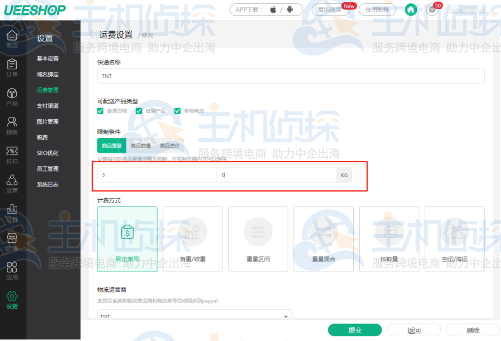 如果重量的没有上限,例如5kg以上都能使用该快递,那最后的数字填写0,如下图:
