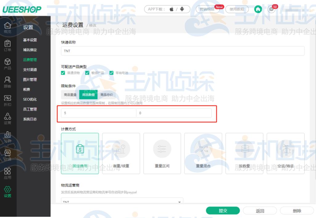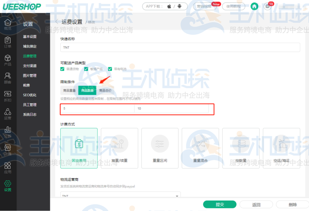 如下图,在限制条件,选择商品数量。举例,现在需要设置订单的商品数量在5个-10个之间才可以使用此快递,如下图: