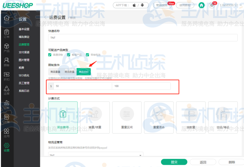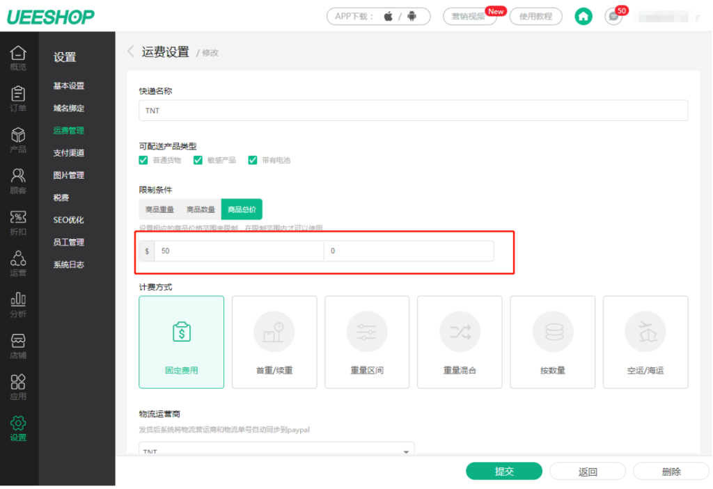 如下图,选择商品总价;举例,商品在50-100美金可使用此快递,如下图设置: