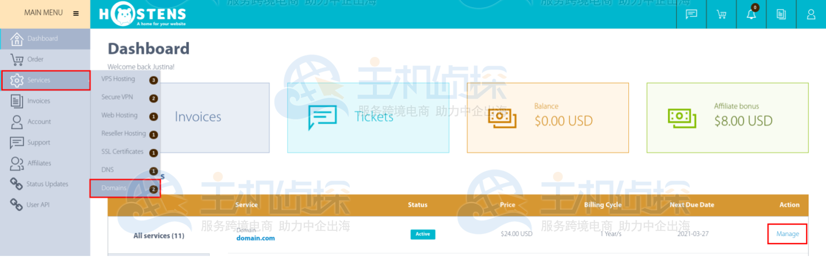 步骤1:从您的Hostwinds客户区,点击域下拉菜单。