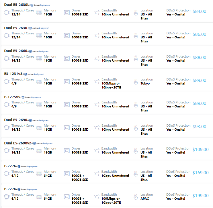 | CPU | 内存 | 硬盘 | 流量 | 带宽 | 价格 |