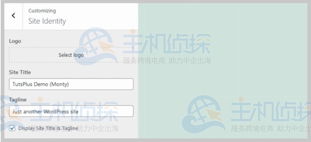 之后,您可以在大多数免费主题中点击站点标识进入以下屏幕。只需点击选择徽标,然后从媒体库中选择您的徽标即可。