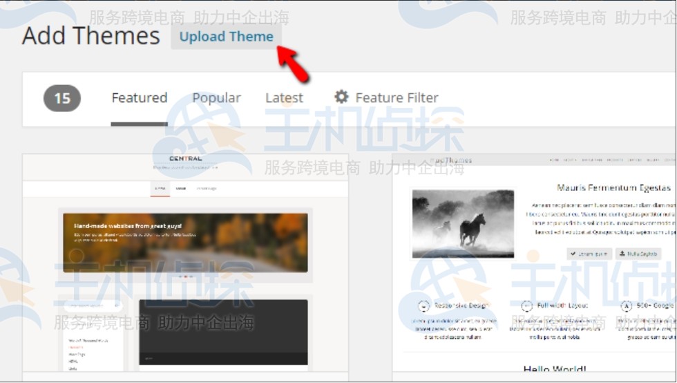 一旦点击这个按钮,将被重定向到添加主题页面,在那里通常会搜索WordPress主题。但是这一次需要点击位于页面左上角的上传主题按钮(因为主题是由你添加的,而不是在建议的主题上搜索的)。