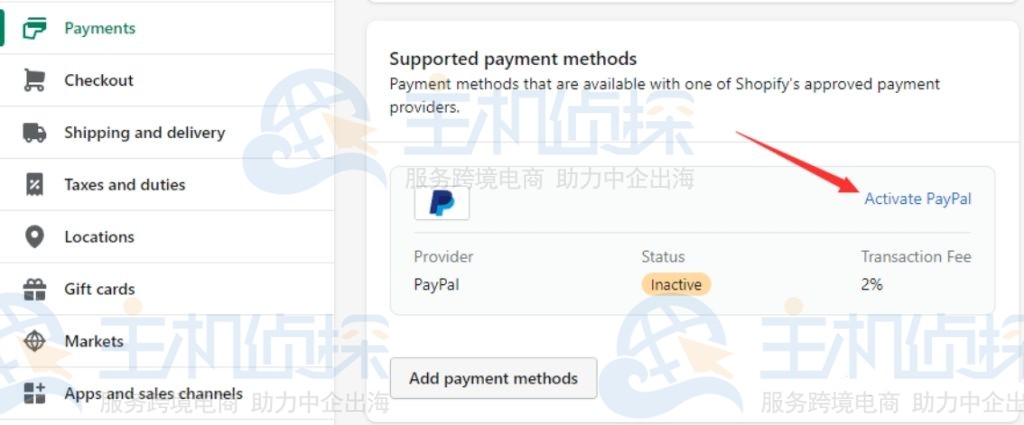 登录Shopify后台,进⼊Setting(设置)> Payment Provider(⽀付服务提供商),点击Activate PayPal Express Checkout 绑定 PayPal企业账⼾。