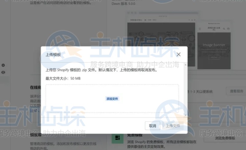 注意事项:上传的文件必须是ZIP格式的压缩文件,Shopify独立站上传模板文件最大50M,如果你的ZIP文件超过50M,将无法上传。