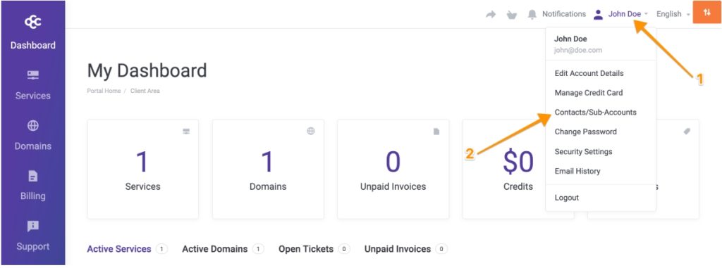 4) 如果您希望授予对客户端区域的访问权限并允许新联系人进行更改,请选中“激活子帐户”框。完成此操作后,您可以为他们分配密码,并授予他们您认为用户需要的权限。
