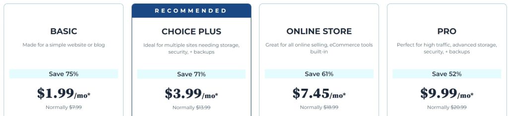 四种方案分别是BASIC、CHOICE PLUS、ONLINE STORE、PRO,如果预算充足的话,推荐CHOICE PLUS方案,价格:$5.45,支持搭建50个网站,50GB SSD硬盘存储,流量不限。