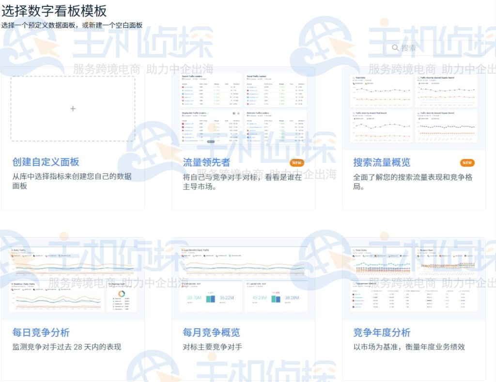 Similarweb数据看板可帮助用户构建自定义数据仪表板或使用基于通用指标的预定义模板,例如搜索流量概况、每日竞争分析等。
