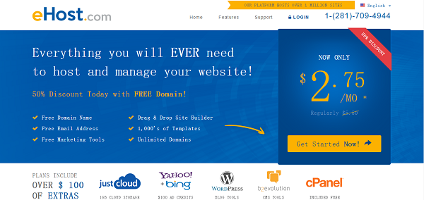 eHost虚拟主机提供免费域名,价值100美元的Google广告奖励,以及100美元的雅虎和Bing广告信用。除此之外,还提供100美元的设计组件,300美元的营销组件和50美元的支持组件等。目前这些组件都免费提供。