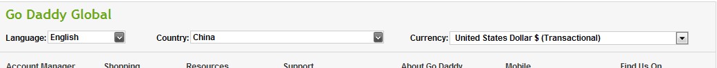 方法很简单,只要在GoDaddy页面底部的Godaddy Global设置中将country(国家)选择为”China”,Currency(货币)选为“United States Dollar”即可在支付的时候显示支付宝付款选项,要注意,一定要这样选择才可以的,不要选择“Chinese Yuan”,如果你国家没有选择China或者货币没有选择USD,都会导致最后付款的时候没有支付宝选项。