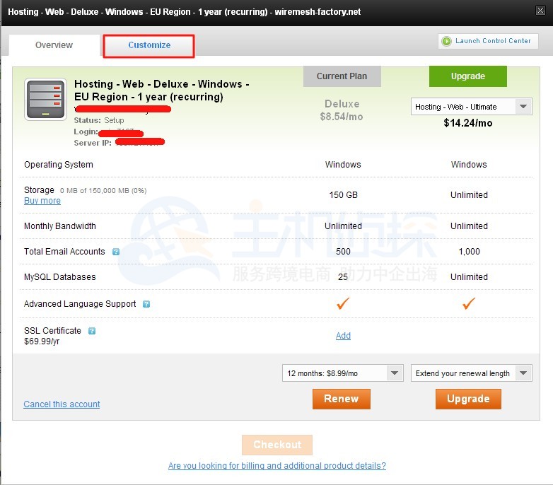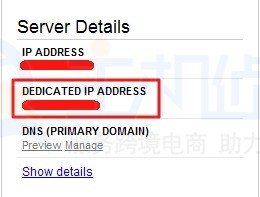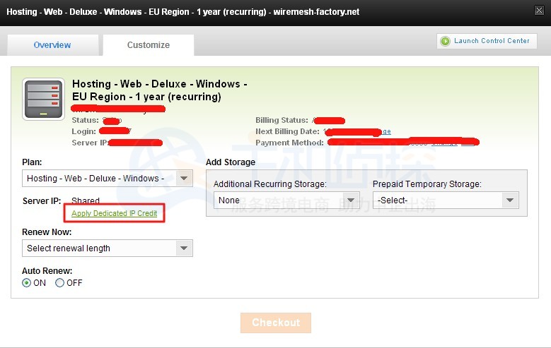3、进入”Customize”之后可以看到当前的服务器IP为共享IP(Server IP:Shared)。在服务器IP下面有一个”Apply Dedicated IP Credit”。点击这个连接就可以添加独立IP了。