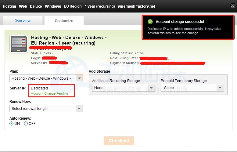 4、如图,点击三中所诉连接之后,可以看到在右上方有一个提示,”Account change Succesful”。同时可以看到服务器IP变成了Dedicated。说明独立IP已经添加成功了