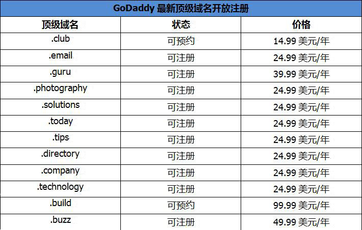 上图是这次12个顶级域名的基本信息,价格最低的是.club为一年14.99美元,最高的是.build为99.99美元,.guru价格是39.99美元/年,.buzz的价格是49.99美元,其中.email、.solutions等8个顶级域名的价格均为24.99美元/年。