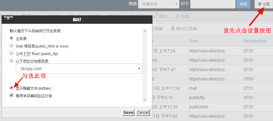 2、单击“文件管理器”选项,加载文件管理器后,单击“设置” 按钮,确保选中“ 显示隐藏文件(dotfiles)” ,然后单击“ 保存” 如下图所示: