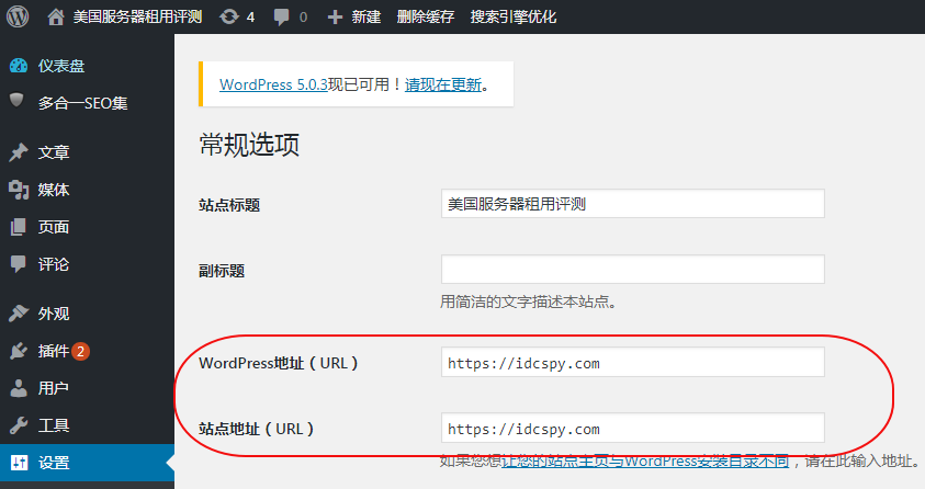 3、将WordPress网址和网站网址从http://idcspy.com更改为https://idcspy.com(需要将idcspy.com更改为你的域名 ),然后点击保存更改 。