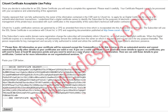 这里包含了你上一步提交的详细信息。如果你想从权威认证机构如Thawte或 VeriSign获得永久SSL证书,你需要用到这个请求。