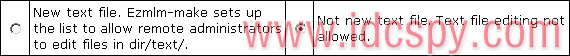 在这里,你可以允许远程管理账号对组成大部分ezmlm自动回复的文本文件进行编辑。只有当目的地址是远程管理账号时才发送回复。通过这个选项,ezmlm会根据-edit指令自动回复dir/text/下的文件列表。列表中只包含可以编辑的文件。远程管理账号可以通过发送含有新文本内容的邮件对dir/text/中的任一文件进行编辑。而ezmlm会发送一个包含文件和编辑方法的信息来回应这一指令。一个基于日期,文件名和文件内容的cookie会被添加至“Reply-To”地址中。这个cookie会在文件被修改时,或者之后27小时(或更短时间)内失效。而且,这个cookie不能用来修改其它文件,即使是内容完全相同的文件。