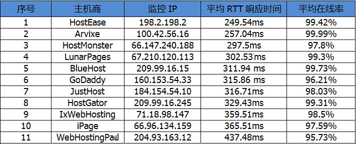 上图是12月份11家美国虚拟主机商的月度评测结果。从图中可以看出,HostEase美国主机平均RTT响应时间最短,为249.54ms;而WebHostingPad主机的平均RTT相应时间最长,均值为437.48ms。从平均在线率可以看到,最高的为Arvixe,在线率高达99.99%,而最低的为WebHostingPad,在线率只有95.73%。
