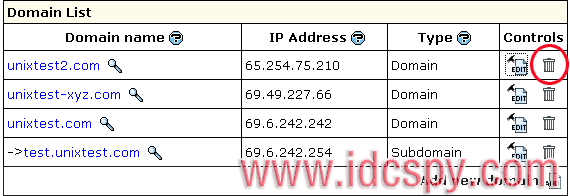 •点击域名右边的“垃圾桶”图标(如图),删除相应的域名。
