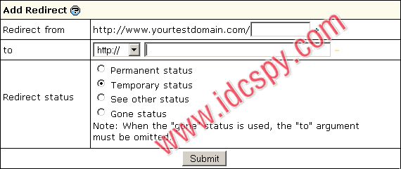 例:如果你在“Redirect from”栏中输入http://www.demo.com/products,在“to”栏中输入http://www.demo.com/new_products.html,那么用户在敲入http://www.demo.com/products的网址后,看到的将是http://www.demo.com/new_products.html的页面。
