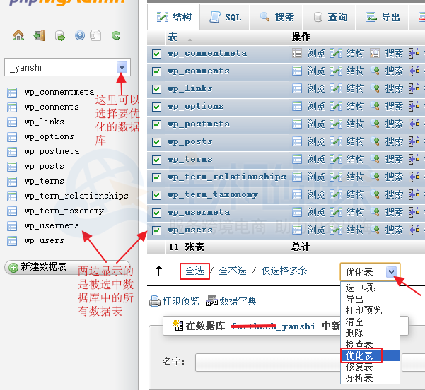 三,选中要优化的数据库,点击打开可以看到该数据库下的所有数据表,选择要优化的数据表打勾或者点击“全选”优化所有表,点击下拉复选框,选择“优化表”,如下图:
