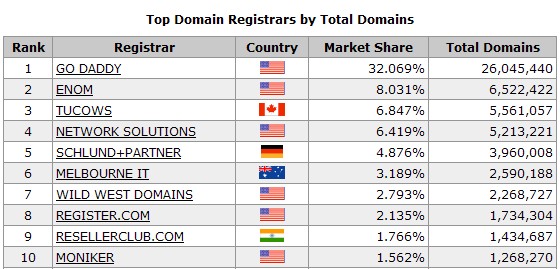 近期,专业的第三方评测统计机构Webhosting.info公布的最新数据,整理发布了2013年上半年全球域名服务商域名注册保有量TOP10的排名,从发布的数据显示,2013年上半年全球域名服务商市场份额基本保持稳定,Godaddy以32.069%独占鳌头,排名第二的是ENOM,但其市场份额与Godaddy相比相距甚远,仅为8.031%。